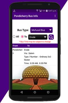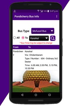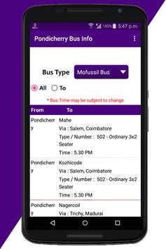 This app provide all information about Pondicherry Mofussil bus and Town bus.