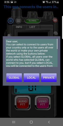 Aplikasi ini bertindak seperti Walkie Talkie yang sebenar dengan suara yang sangat tinggi dan juga video!saluran itu dengan semua orang lain yang menggunakan aplikasi yang sama ditetapkan ke saluran yang sama.