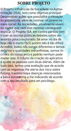 Projek pengaruh masyarakat dalam Auto (ISA), objektif utama: untuk membangunkan tindakan yang membolehkan ketinggian harga diri, serta memotivasi golongan muda dalam persekitaran sosial.Masyarakat, kini hidup pada visi yang tidak dapat dijelaskan.Projek ISA, terhadap permulaan datang untuk membawa sekolah awam untuk membahaskan subjek yang diterokai sedikit.Jika penyayang hari ini tidak begitu mudah, tetapi ia tidak begitu sukar.Percayalah, kita semua berbeza dan kita mempunyai kecacatan dan kualiti yang luar biasa, kita sangat mengagumkan dan apa-apa standard boleh mengubahnya.Hasrat untuk mewujudkan aplikasi adalah untuk membantu orang dengan tip harian.Sebagai tambahan kepada semua ini, kami mempunyai penilaian yang menurut respons memberi amaran kepada anda tentang risiko gangguan dan penyakit masa depan yang berkaitan dengan harga diri yang rendah dan menunjukkannya mengikut keputusan anda untuk ahli psikologi.