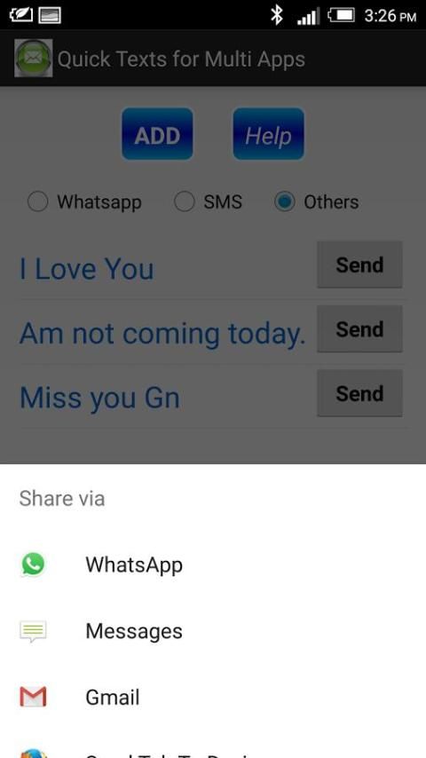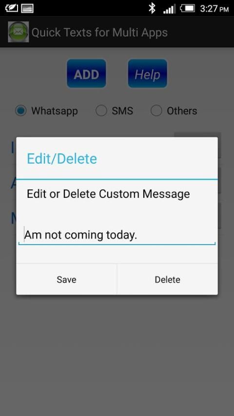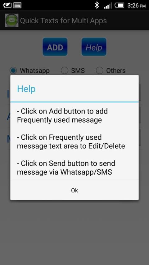 Quick Texts for Multi Apps will helps you to send Frequently used messages through Whatsapp or SMS or any other Apps which takes Text as input just by one/two clicks. You can create any number of custom/frequently used messages.
