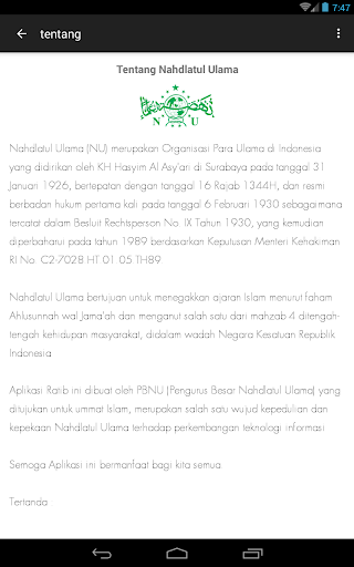 Aplikasi Ratib Al-Athos persembahan Nahdlatul Ulama untuk memudahkan dalam pembacaan Ratib Content : - Nash Ratib berbahasa Arab - Sejarah Ratib Al-Athos - Fadhilah - Tentang NU