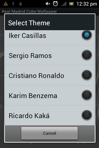 For Real Madrid C.F Fans!Enjoy Madrid's Players in 3D cube live wallpaper.Configurable theme and animation.Available theme:- team - Iker Casillas- Sergio Ramos- cristiano ronaldo - Karim Benzema- Ricardo KakaHow to use:Long press on home screen -> Wallpaper -> Live Wallpaper -> Real Madrid Cube WallpaperAny feedback will be appreciated