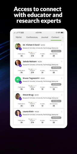 dari seluruh dunia berkumpul untuk berkongsi pengetahuan dan belajar melalui bahan pembelajaran yang diperibadikan dan maklumat terkini dari dunia penyelidikan. Aplikasi ini akan mengadakan bengkel, seminar, persidangan dan simposium secara langsung dari pelbagai bidang penyelidikan. Pengguna boleh
