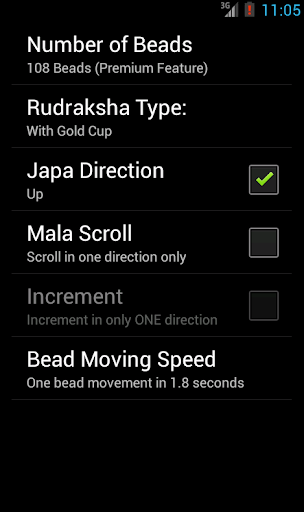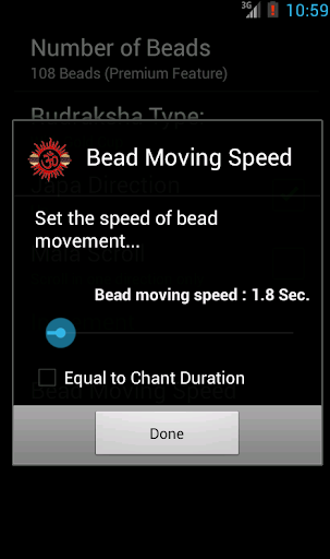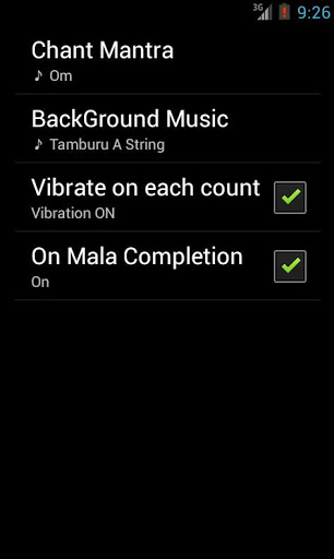 can set a background music (Thamburu or Om) and you can select between three types of rudraksha beads