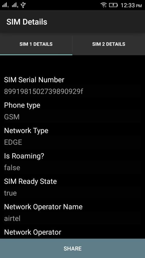 Simple application to display information about SIM card in your device. It shows also Device Details. This application has also Widget to open application directly. This application doesn't support dual SIM. ~~~~~~~~~~~~~~~~~~~~~~~~~~~~~~~~~~~~ NOTE: Install application in phone memory to enable widget. Link : https://play.google.com/store/apps/details?id=com.sim.simdetails ~~~~~~~~~~~~~~~~~~~~~~~~~~~~~~~~~~~~~~~~~~~ List of supported parameters: ~~~~~~~~~~~~~~~~~~~~~~~~~~~~~~~~~~~ • Mobile Number(If your device supported) • SIM Serial Number • SIM Operator Name • IMEI Number • Device Software Version • Network Country ISO • Network operator • Subscriber ID • Voice Mail Number(if exist) • SIM Country ISO • SIM Operator ID • Roaming Service (True / False) • Phone Type • Data State(GPRS State) ~~~~~~~~~~~~~~~~~~~~~~~~~~~~~~~~~~ List of Device Details: ~~~~~~~~~~~~~~~~~~~~~~~~~~~~~~~~~~~ • Bootloader • Brand • CPU ABI • CPU ABI2 • Device • Display • Fingerprint • Hardware • Manufacturer • Product • SDK Version ([Facebook Page...](https://www.facebook.com/androidPAIDAppsForFREE "Facebook Page" "Facebook Page..."))