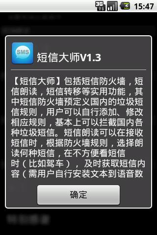 Simple and powerful SMS tools SMS Master Plus including SMS firewall, reading SMS ,SMS transfer and other useful features. SMS firewall can idenfify the rules of domestic spam messages. User can add, modify the corresponding rulesSupport for regular expressions,and all kinds of domestic spam messages can block basically,long touch filtered SMS,it can popup menu, and the filtered SMS will be resotred to the system inbox.. Reading SMS can select which messages to read when receiving the SMS according to the firewall rules. when you read the message inconvenienteg.driving, you also can get the message timely. SMS transfer can be forwarded to the specified phone by setting the number and type of transfer when the mobile phone is not around you.More exciting features will soon be added, so stay tuned.Bug reportmysms.master@gmail.comV1.3.3Share this app.Transfer SMS must first change the default password increased security V1.3.2Add default password prompt Only for english versionV1.3.1Fixed can not reset the passwordV1.3Add password protection when set SMS transfer optionV1.2Multilanguage support Simplified chinese Traditional Chinese, EnglishAdd SMS transferKeywords:SMS interception, SMS transfer, spam filtering, reading SMS, SMS, firewall