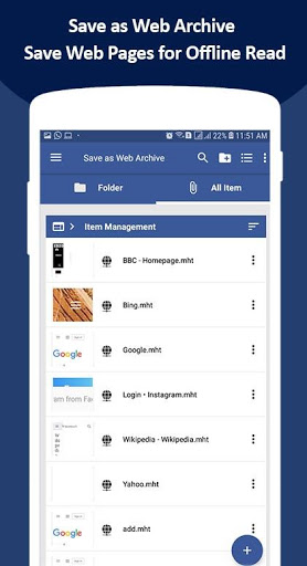 Simpan sebagai Arkib Web adalah aplikasi terbaik yang memberi anda cara untuk menyimpan halaman web untuk dibaca kemudian. Alat terbaik untuk Menyimpan Halaman Web untuk Pembacaan Luar Talian. Aplikasi menukar web ke Arkib MHT bermaksud anda dapat Menyimpan mana-mana web halaman ke arkib MHT hanya dengan satu klik. jika anda menjumpai beberapa artikel yang menarik di web, anda boleh menyimpannya secara langsung untuk dibaca di luar talian dengan aplikasi Web Clipper-Save as Web Archive terbaik ini.