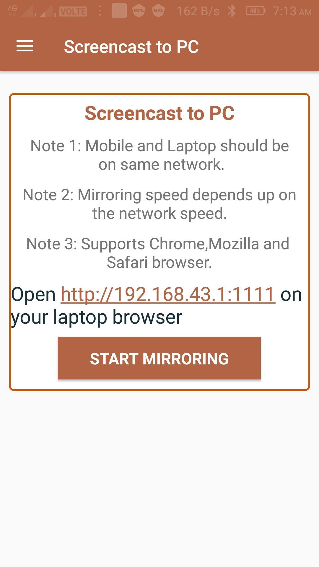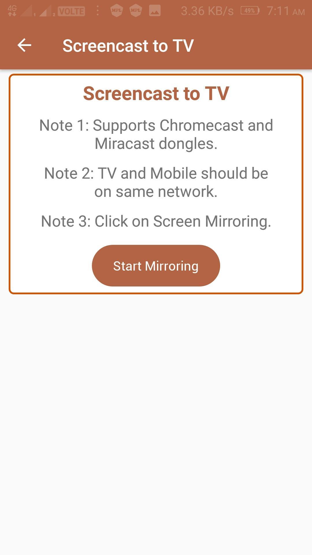 Screen Cast Display finder app will help to find share your mobile/Tablet device screen to suitable/ compatible Miracast/Wireless display device such as Smart TV or Wireless display dongles/adopters. This Cast Screen Android works (Tested) on most of the mobile phones with Android version 4.2 and above. With the help of this browser based Screen Stream you will be able to use Screen Mirror more conveniently to mirror your screen or use the cast feature from supported applications.