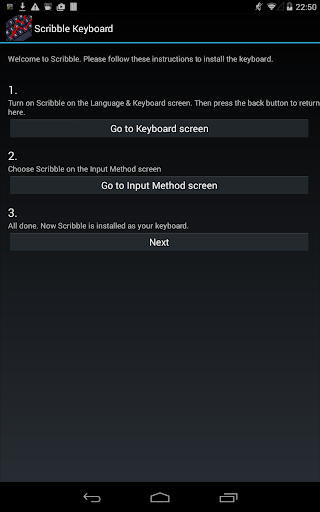 When the app is first installed you will be presented with an installation screen. Follow the directions on the screen to install the keyboard as your default keyboard.