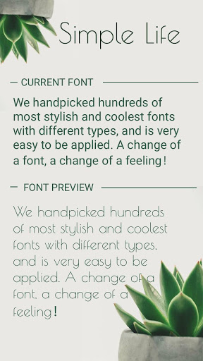 Simple Life membolehkan semua pengguna menukar fon sistem telefon atau tablet anda _START. Disokong untuk peranti yang mempunyai FlipFont ™ (Samsung Galaxy S3, S4, S5, Nota, Nota Ⅱ, Nota Ⅲ) untuk menukar fon dengan sempurna atau akses root. Ini benar-benar pemasang FlipFont yang terbaik untuk android!