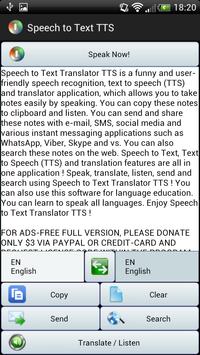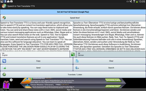 Speech to Text Translator translates your speech in real-time so that you can speak with people with different languages all around the world. Speech to Text Translator TTS is a funny and user-friendly speech recognition, text to speech (TTS) and an instant live translator application, which allows you to take notes easily by speaking.