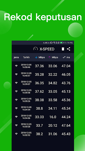 Laporan kelajuan wifi masa nyata direkam pada halaman hasil. Hanya luncurkan skrin untuk memeriksa dan memadam data ujian kelajuan. Mudah untuk menganalisis perubahan nilai kelajuan internet dengan membandingkan data sejarah. Alat ini juga boleh menyemak kelajuan internet. Server stabil itu boleh menyokong permintaan kelajuan wifi juta setiap minit. WiFi Master akan membawa lebih banyak detail kelajuan internet kepada anda Jika anda ingin memulakan ujian 3g, 4g & kelajuan wifi. Maklumat ujian wifi ini mempunyai jenis rangkaian, muat turun, muat naik & nilai ping. Cek WiFi boleh dengan mudah melayari halaman hasil.