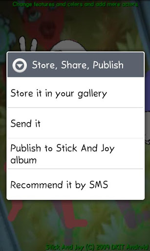 Want to spice up your MMSEmail or pictures taken with your camera Add the cartoon figures Mr Stick and Ms Joy for hilarious effect Change their hairstyles, eyes, hands, mouths, poses, and colors. Add picture text.Store or send as MMS, email or post to the Global picasa Album PicSay and Camera ZOOM on steroids