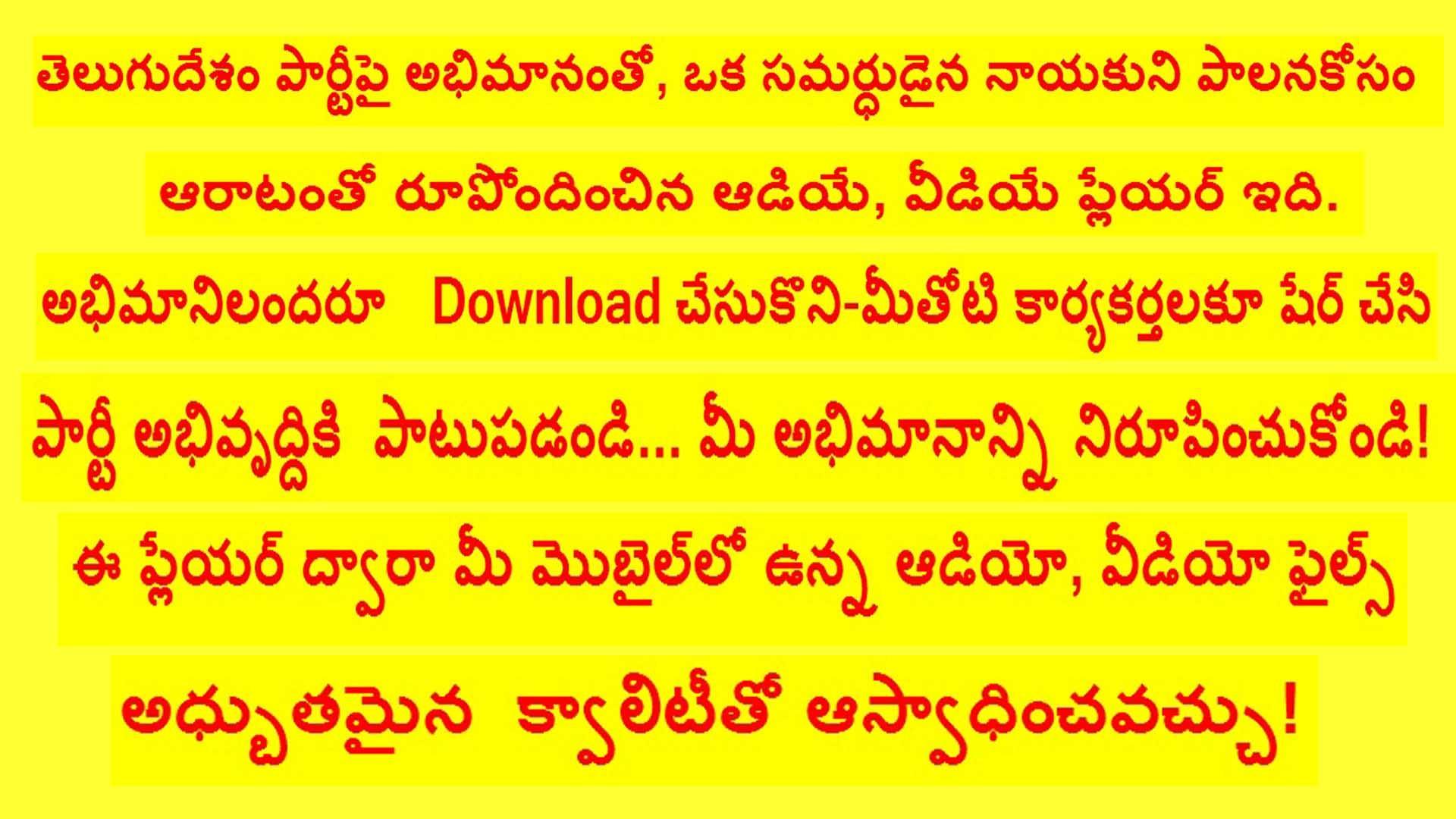 తెలుగుదేశం పార్టీపై అభిమానంతో, ఒక సమర్ధుడైన నాయకుని పాలనకోసం ఆరాటంతో రూపోందించిన ఆడియే, వీడియే ప్లేయర్ ఇది. అభిమానిలందరూ డౌన్‌లోడ్ చేసుకొని-మీతోటి కార్యకర్తలకూ షేర్ చేసి పార్టీ అభివృద్దికి పాటుపడండి... మీ అభిమానాన్ని నిరూపించుకోండి!