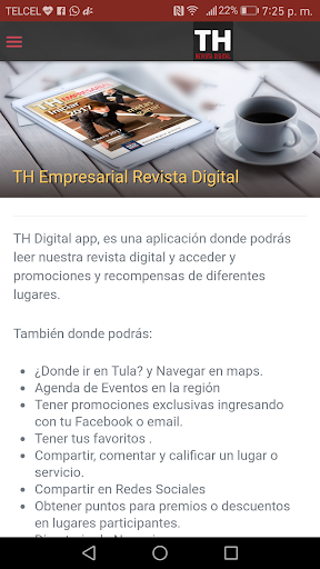 TH App es una aplicación para la región de Hidalgo donde podrás encontrar los mejores lugares, productos y servicios, obtener premios por fidelidad en negocios participantes y descuentos exclusivos.Así mismo podrás leer nuestra Revista TH Digital, una nueva era en revistas.