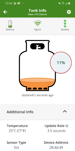 3. Balikkan tangki ke atas. Setelah cecair menetap aplikasi akan memaparkan bacaan. Perhatikan bahawa cecair LPG akan berkurang di dalam tangki selama beberapa minit dan kualiti pengukuran akan rendah hingga ini stabil.