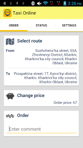 Dibuat di Ukraine.Pesan Teksi dengan lima klik dalam talian.Sokongan Peta Google.Nyatakan kos perjalanan sendiri.