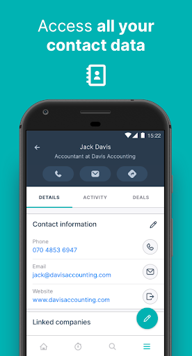 🗂️ Dapatkan akses segera ke semua data hubungan anda. Mempunyai pangkalan data CRM lengkap anda di hujung jari anda, tidak kira di mana anda berada. Akses dan kemas kini maklumat hubungan untuk petunjuk atau pelanggan, dan lihat sejarah semua interaksi sebelumnya.