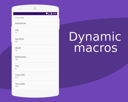 Also includes dynamic macros like current date, time etc. Check out the whole list under Expand > Settings