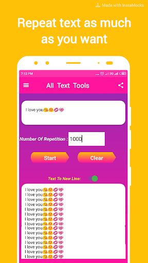 By using this application you can send the same message at multiple times. This app is combo pack for the all repetition app with a low size of the APK It is one kind of message repeater to send message repeatedly, and also you can set your repetition limit with new line text repetition. Using this app you can also make repeated letters using alphabet and emoji characters. Also, provide random emoji characters. Very easy to use and required few click for your message repetitions. Repetition process works asynchronously for longer repetition limits.