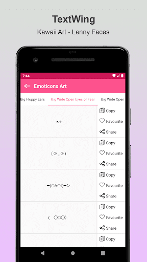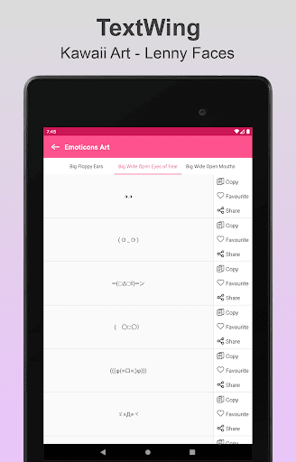 Lebih 10000 Emotikon untuk berkongsi dengan rakan-rakan dan ahli keluarga. Kaomoji adalah gaya emotikon Jepun yang popular yang terdiri daripada watak-watak Jepun dan tanda-tanda tatabahasa, dan digunakan untuk menyatakan emosi dalam menghantar dan komunikasi siber. Perkataan kaomoji juga sinonim untuk dirujuk sebagai emotikon Jepun.