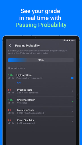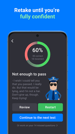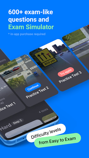 Terdapat beberapa tahap kesukaran yang boleh anda pilih. Anda boleh mengambil ujian mengejek dalam apa-apa pesanan tertentu, tetapi kebanyakan pengguna pergi dari mudah untuk peperiksaan simulator. Untuk menyikat di kawasan tertentu manual kod lebuh raya, anda boleh mengamalkan ujian teori memandu khusus untuk tanda jalan, peraturan jalan, atau denda & had laju. Terdapat juga pertunjukan saya memberitahu saya ujian mengejek (anda akan memerlukannya sebelum ujian memandu sebenar anda). Lawati Cabaran Bank (tab paling sukar) untuk mengerjakan soalan yang telah anda ketinggalan.
