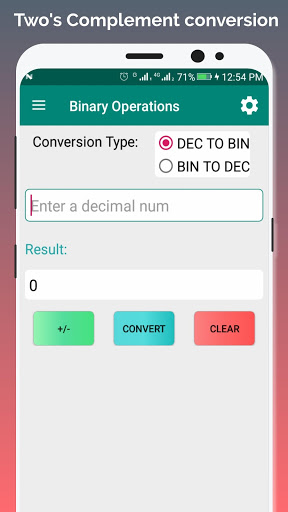 Furthermore, this app has functionality for two's complement as well as normalized mantissa exponent binary representation. This feature is mostly useful for Cambridge A-levels students to check their result after calculation. You can now easily convert from binary to denary or vice-versa, using this tool. Further notes are available under developer notes in the app.