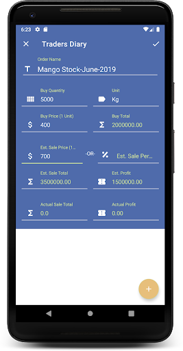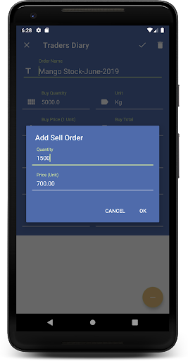 Sekarang anda ingin penjualan yang mangga untuk pembeli & ingin menambah rekodnya. Klik pada kad pesanan mangga ia akan membuka kad butiran utama. Sekarang, Di sebelah kanan skrin, butang bulatan kuning adalah klik mereka. Ini akan membuka dialog dalam dialog tersebut selebihnya stok pesanan & harga jualan yang ditetapkan setiap unit akan muncul. Anda boleh mengubah kedua-dua nilai tersebut sekiranya berlaku tawar-menawar dengan harga jualan pembeli akan berubah sehingga anda dapat mengubahnya secara manual atau jika tidak, anda dapat meneruskannya. Dan apabila anda mengklik ok, ia akan menambah rekod penjualan (1000 Kg pada 750 Rs per Kg = 7,50,000 Rs) di skrin tersebut & skrin utama akan dikemas kini dengan stok baru & harga kekal. Anda boleh menambah pesanan penjualan sehingga stok menjadi sifar.