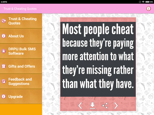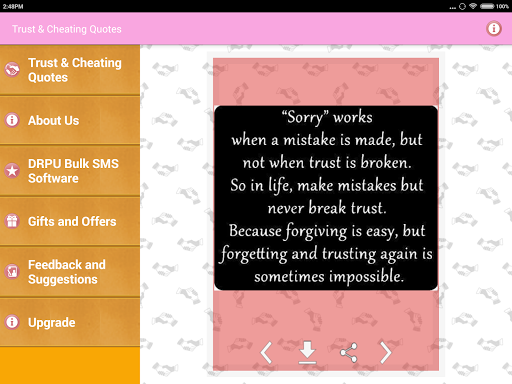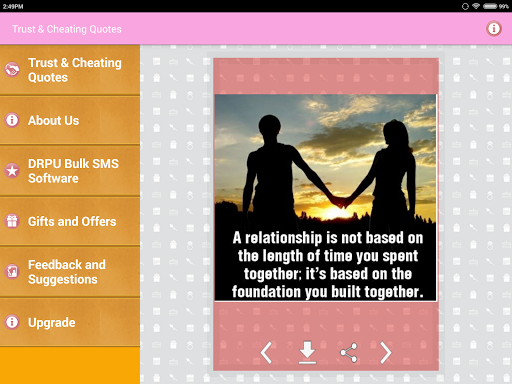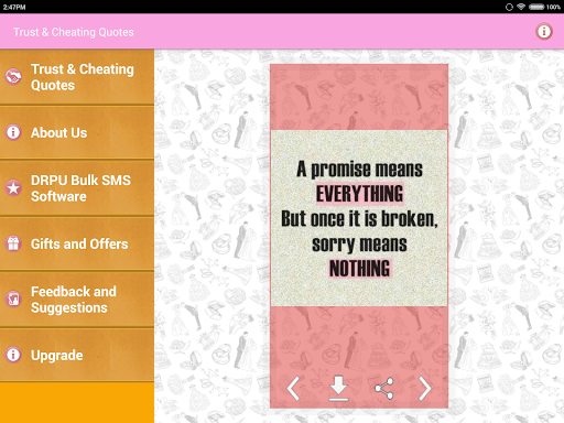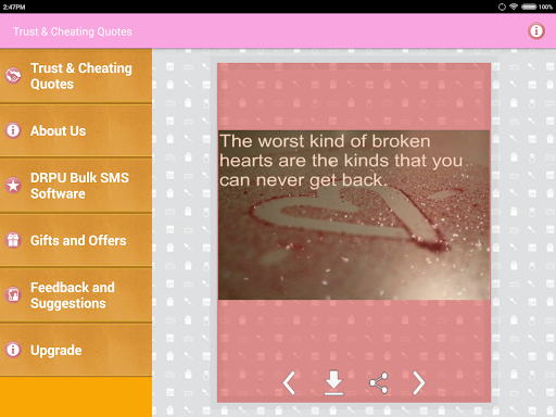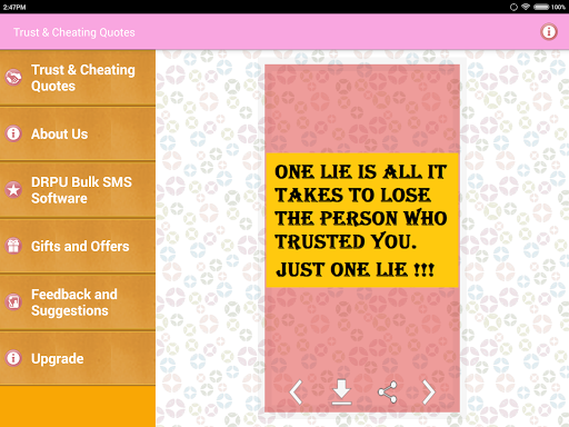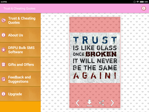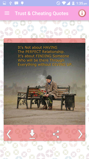 Koleksi sebut harga terkenal yang mengatakan gambar-gambar dan pelajaran kehidupan Imej tentang kepercayaan dan penipuan hubungan seperti cinta, persahabatan dan perkahwinan dan lain-lain. Hanya mereka yang percaya, dapat mencari cinta dan kebahagiaan.Dan hanya mereka yang suka, boleh dikhianati.Jangan berlari dalam kekurangan kata-kata kerana menyatakan perasaan kesedihan dan kesepian anda.