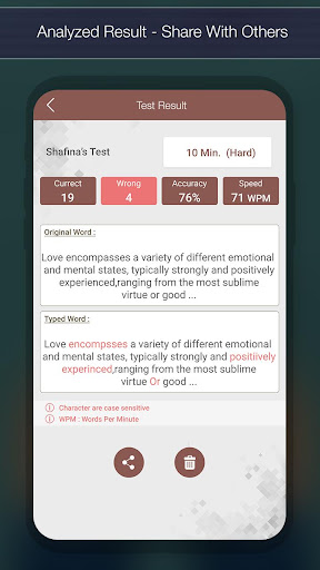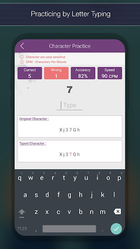 Masukkan satu aksara pada satu masa untuk belajar menaip.Cari statistik (CPM - aksara seminit) dari watak yang ditaip.untuk perkataan seterusnya.Statistik (WPM - Perkataan seminit) akan menunjukkan ketepatan dalam kata -kata seminit.Br> Laporan menaip penuh & amp;Analisis: