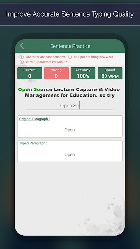 Selepas menggunakan aplikasi ini, anda akan meningkatkan kelajuan menaip anda.Meningkatkan menaip dengan mengamalkan ayat, sebelum muncul untuk menaip cabaran.