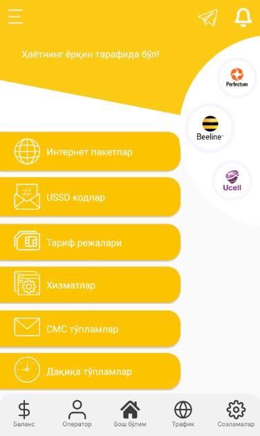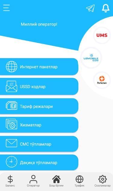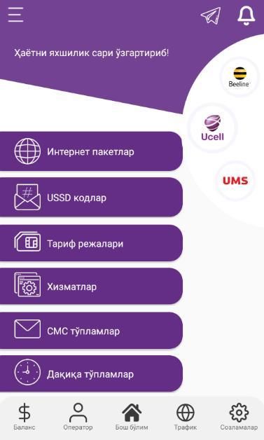 By installing the application you will receive answers to all questions and the following opportunities from mobile operators of Uzbekistan - UMS - UMS, Uzmobile - Uzmobayl, Ucell - Usel, Beeline Beeline and Perfectum - Perfectum: