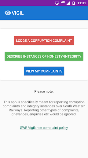 VIGIL app is developed by South Western Railway to enable its customers, employees and stake holders to file complaints related to corruption & bribery. The app also facilitates users to submit any instances of integrity and honesty that they have come across during their travel, business or dealing with South Western Railway.