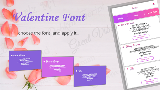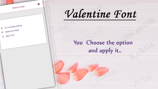 application. "Font Styles" contains many more free fonts for all devices to use it instead of your old font. Valentine Font Style provides you with the ability to change your device font for free. Font Styles makes a great impression while using different fonts. Font Styles shows the fonts applicable to your device clearly so you can choose the font you like and apply. Font Styles should work on any smartphone that allows the custom fonts.