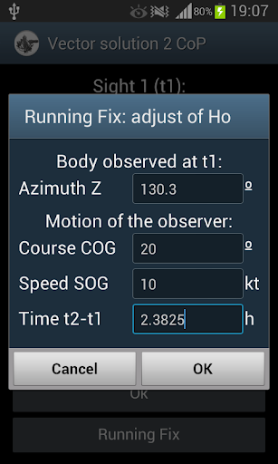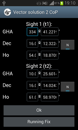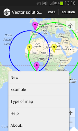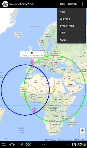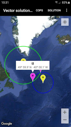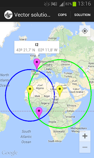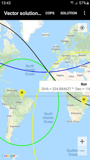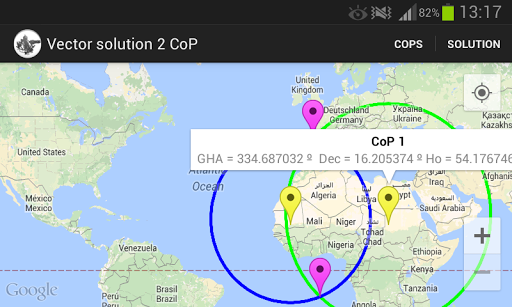 Aplikasi ini akan mengira kedua-dua penyelesaian, dan akan menarik Lingkaran kedudukan, atau bulatan ketinggian yang sama di Peta Google.