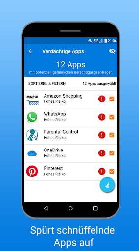 Dalam versi PREMIUM, pembersih Android juga melindungi anda dari aplikasi pengintip dan rangkaian WiFi yang tidak selamat.