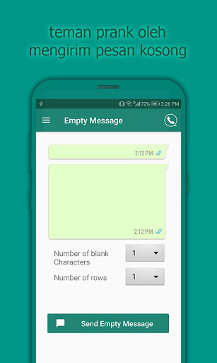 Gurauan untuk whatsapp ini membolehkan anda menghantar mesej kosong kepada rakan anda. Anda boleh mengatur ruang kosong mengikut baris dan lajur dan kemudian menggunakan ciri pengirim pesanan kosong untuk mengirim pesanan kosong. . Cukup, tekan nombor mengikut kod negara dan kemudian hantar dengan mengetuk Kirim.