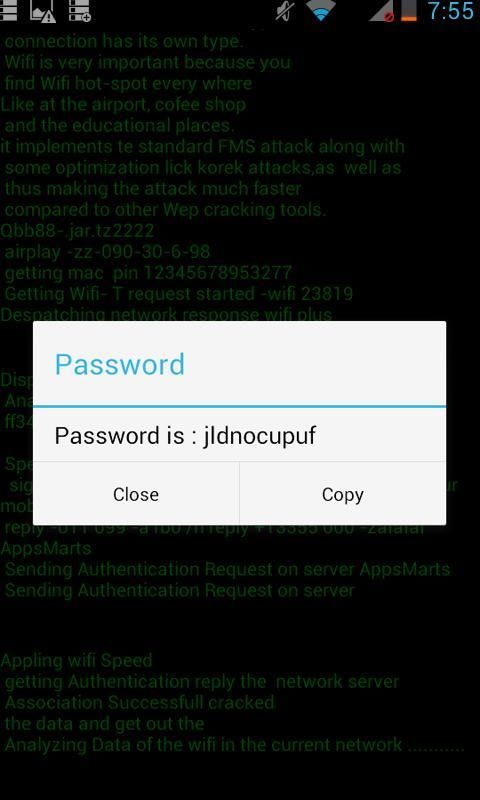Wifi password hacker is a prank application that gives an impression that you can hack secret wifi passwords. This application gives an impression that you can hack secured wireless networks protected by WPS,WEP ,WPS2, AES or WPA2 encryptionThis application will show you all available wifi networks and will click on it, a real like processing will start and at the end a password will be shown