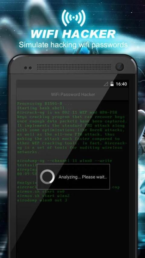 Free Wifi Password Hacker is a funny prank app that simulates breaking into secured wireless networks protected with passwords AES, WPA2 or WPA encryption. This Wifi Password Breaker will display a professional hacking and analysis animation. After the hack program has completed, it will generate a fake password. All you friends will be impressed that you can break their WiFi hotspot and believe you are a real hacker and technical genius. This is a very delightful prank to play on your friends.