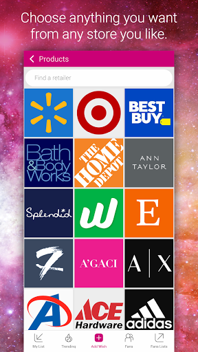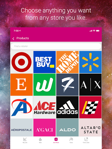 Cari, kumpulkan, gabungkan dan uruskan hadiah dari beribu-ribu peruncit termasuk senarai keinginan Walmart, senarai keinginan Amazon, senarai harapan Sasaran, senarai keinginan Bath & Body Works, senarai keinginan Etsy, Tempat Tidur dan Beyond senarai keinginan, senarai keinginan Kohls, senarai harapan The Home Depot, senarai keinginan Best Buy, Walmart Registry, Target Registry, Amazon Registry, Bed Bath and Beyond Registry, Babylist.com, BuyBuyBaby, The Knot, Zola, HoneyFund, Crate & Barrel Registry, Pottery Barn Registry , Pendaftaran Williams-Sonoma, senarai harapan Wayfair, Pendaftaran IKEA, Depot Pejabat, WishExpress, senarai harapan Overstock.com, Neiman Marcus, Groupon, A'GACI, A | X Armani Exchange, Ace Hardware, Adidas, Aéropostale, Altar'd State, Amerika Eagle, Gadis Amerika, Ann Taylor, Asics, AutoZone, Aveda, Backcountry, Bare Mineral, Barnes & Noble, Barneys New York, BCBG, Belk, Banyak, Bloomingdales, Bose, BoxLunch, Brooks Brothers, Buckle, Build-A-Bear , Burberry, Kedai Burlington, Calvin Klein, Carhartt, Carter's, Catherines, C hanel, Charlotte Russe, Champs, Chewy, Christopher & Banks, Clarks, Claire's, Cole Hann, Columbia Sportswear, Cost Plus World Market, Crocs, Diesel, Disney Store, DKNY, Dockers, Dr. Martens, Dressbarn, Ecco, Kasut terkenal, Garis Finish, Selamanya 21, Fosil, Orang Percuma, GameStop, GNC, Godiva, Goop, Gucci, GUESS, Gymboree, Hammer Made, Helzberg Diamonds, Hickory Farms, Topik Panas, HSN, Hugo Boss, Ikea, IT'SUGAR, J. Crew, J.Jill, Janie & Jack, Jared, Jimmy Choo, Journeys, Justice, Kate Spade, Kay Jewelers, L'Occitane, Lacoste, Lane Bryant, Lids, LOFT, Lou & Gray, Lovesac, Lucky Brand, Lush, MAC Kosmetik, Meijer, Michaels, Kedai Microsoft, Nickelodeon, O'Reilly Automotive, Oakley, Origins, Pac Sun, Pandora Jewelry, Perry Ellis, PetSmart, Piercing Pagoda, Prada, Puma, QVC, Ragstock, Samsonite, Sephora, Sierra Trading Post, Skechers, Nombor Tidur, Solstice, Soma, Spencer, Steve Madden, Sunglass Hut, Super Dry, Swarovski, Swatch, TJ Maxx, The Body Shop, The North Face, The Walking Company, Theory, Tiffany & Co, Tilly's, Timberland, Timex, Tom Ford, TOMS, Torrid, Tractor Supply Co., True Religion, True Value Hardware, Tumi, Typo, UGG , Ulta Beauty, Under Armour, Van Heusen, Vans, Versace, Victoria's Secret, Zales, Zara, Zumiez, Kohls Registry, dll.
