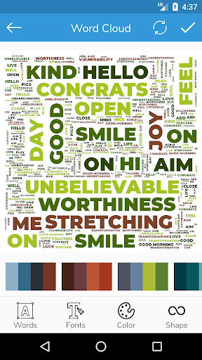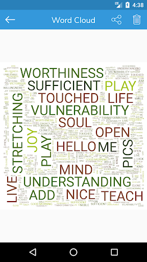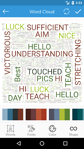 It just takes a few easy steps to create your very own word cloud. Select the words you want to use, choose the color combination and font you like the most. Then just save your word art on your SD Card and share directly within the app. It's that simple! no need to you complicated photo editing software, this word cloud maker will create the art for you.