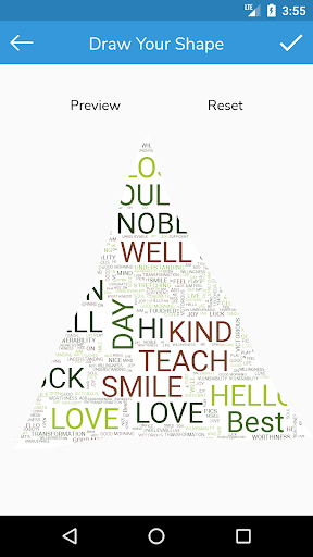 With this app you can draw a custom shape instead of having to select a shape. This allows you to create totally unique and custom designs compared to what you can do with other word art design apps. You can edit the word cloud within the app so you don't have to use another app and share directly. The word cloud tags will automatically fit into the custom shape and choose the visibility of each word tag.