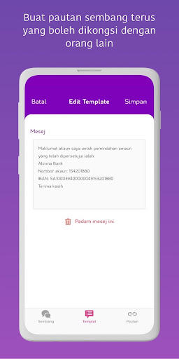 • Simpan mesej templat yang anda hantar dengan selalu pada WhatsApp. Simpan mereka di WtsAppy sebagai nota yang boleh dikongsi pada WhatsApp pada bila-bila masa dengan hanya Klik. Ya, satu KLIK sahaja! Templat mungkin alamat pos anda, lokasi anda atau akaun bank anda.