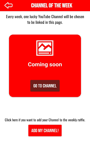 Tambahkan saluran anda ke undian Saluran Minggu untuk berpeluang untuk menang untuk menunjukkan saluran anda sendiri dalam aplikasi selama 1 minggu. Cukup tambahkan saluran anda ke undian dan setiap minggu secara rawak, orang yang bertuah akan membuat saluran mereka diiklankan dengan pautan ke saluran dalam aplikasi sehingga semua orang yang menggunakan aplikasi dapat melihatnya. Semoga berjaya.