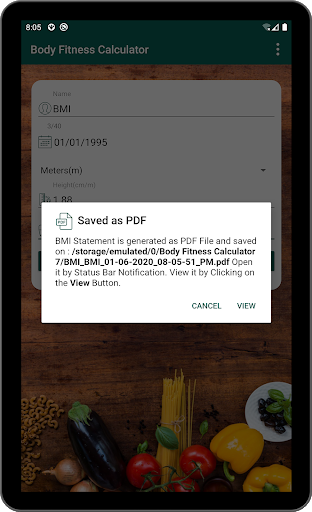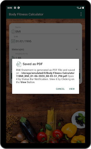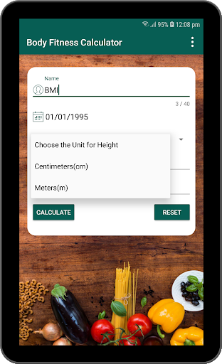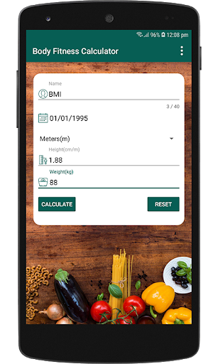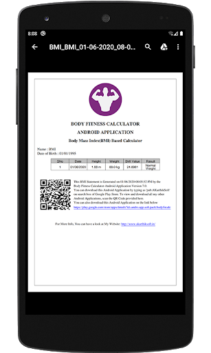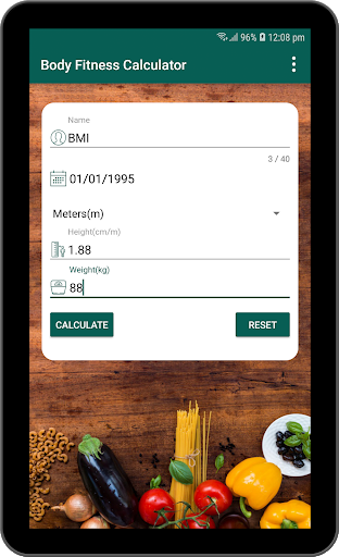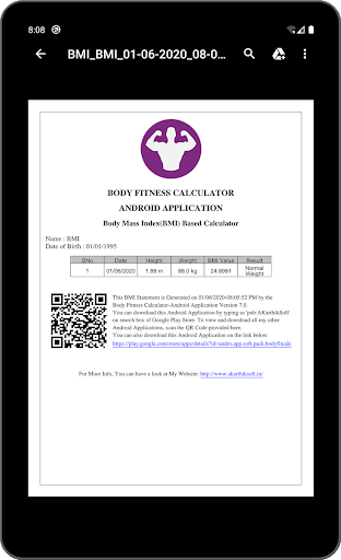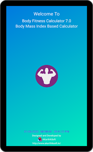 Kalkulator kecergasan badan adalah aplikasi Android yang menyediakan hasil berdasarkan klasifikasi jisim badan [BMI] seperti yang dinyatakan oleh Pertubuhan Kesihatan Sedunia [WHO]. Ia mengira BMI dengan ketinggian dalam sentimeter (cm) atau meter (m) dan berat dalam kilogram (kg). Aplikasi Android ini akan membantu anda untuk memantau kesihatan anda. Ia juga akan menjana fail PDF dengan sejarah lima BMI sebelumnya yang dikira dengan menggunakan aplikasi ini. Anda perlu memasukkan nama anda, tarikh lahir, ketinggian semasa dalam sentimeter atau meter dan berat semasa dalam kilogram.