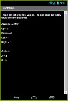 This app is oriented to programmers users. The Remote Control send different characters depending which button was push, the user need programme the slave control. This app is only the master control,