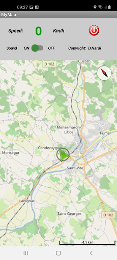 Aplikasi Navigasi Road dengan paparan kelajuan dan overruns 80km / h Zoom 2 jari adalah mungkin, peta tetap menghadap ke utara. CAP diikuti adalah pada kompas.