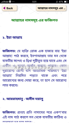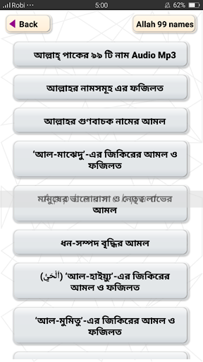 আসসালামু আলাইকুম।সবাইকে অসংখ্য ধন্যবাদ জ্ঞাপন করছি আমার এই অ্যাপটি তে যার মূল বিষয়বস্তু হচ্ছে আল্লাহ পাকের ৯৯টি নাম ও ফজিলত ।অডিও সহ এই অ্যাপ টিতে পাচ্ছেন আল্লাহ্‌র ৯৯ টি নাম ও অর্থ অডিও সহকারে। মহান আল্লাহ্‌ রাব্বুল আলামিন আমাদের সৃষ্টি কর্তা যার গুনের কোনও শেষ নাই। আসমান ও যমীনে এ যা কিছু বিদ্যমান সবই আল্লাহ্‌ এর দান। তাই আসমাউল হুসনা কি ও আল্লাহ এর গুনবাচক নাম এর তালিকা সহ শিখতে চাইলে অ্যাপ টির সাথে থাকুন।