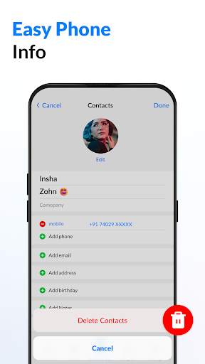- Mudah menambah kenalan dan edit maklumat seperti nombor telefon, e-mel, dan foto