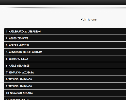 Hello Friends, aplikasi ini telah diberikan biografi orang-orang Etipoian. Berikut adalah biografi saintis, penulis dan pemikir, ahli politik, kebanyakan pemain.